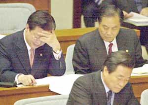 国务总理李汉东等国务委员们在国会本会议场国务委员席位上,听取朝野议员的提问,同时查阅事先备好的资料,准备回答问题。