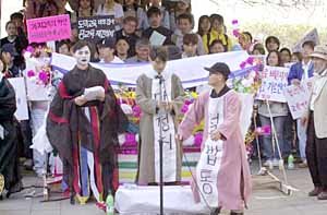 12日(周四)下午,在汉城钟路区世宗文化会馆的露天舞台上,哲学教授们上演警告社会伦理道德崩溃的民俗话剧。