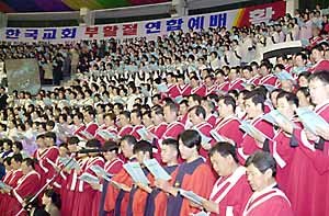 15日凌晨在汉城奖忠体育馆举行的2001年韩国教会复活节联合礼拜上,教堂合唱团正在赞颂着耶稣基督的复活。