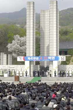 4·19革命41周年纪念仪式,19日(周四)在汉城江北区水逾洞4·19国立墓地举行。总理李汉东、3部政要以及4·19革命41周年有关团体会员、市民、学生等参加了当天的纪念仪式。