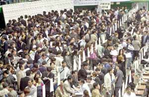 “有没有地方工作?” 24日在仁川市立体育馆举行的“旨在录用大宇汽车退休职员和京仁地区失业人员的招募博览会”上,5千余名的待业人员展开了竞争。