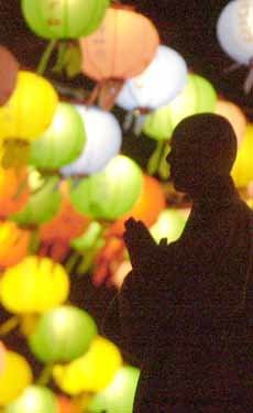 为庆祝释迦牟尼诞辰,燃灯吊满了寺院。在汉城一家灯火辉煌的佛教寺院,一位僧人祈求佛祖慈悲的光芒照遍天下。