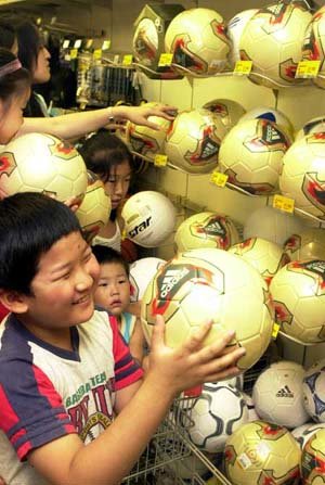 在世界杯期间成为抢手货的2002年韩日世界杯公认球——飞火流星面市后异常热销。16日,央求父母来汉城恩平区新世界E玛特恩平店的小朋友们正满心欢喜地抚摸着球。