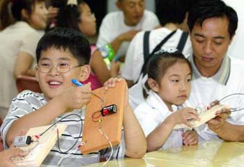 21日上午,参加由韩国Agilent Technologie在汉城冠岳区Boramae公园主办的“家庭科学日”活动的小朋友们,正与父母一起亲手制作可以学习电流原理的实验仪器。