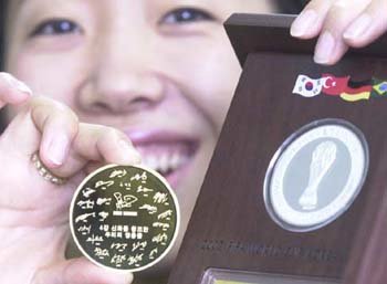 2002世界杯纪念奖牌制造企业KOWOON企业将从23日开始对外销售刻有韩国国家队签名的奖牌。奖牌分为纯金和纯银两种。