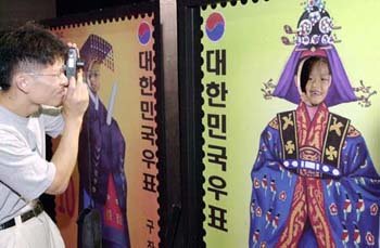 在汉城江南区三成洞Coex展览馆举行的“世界邮票展览会”上,小顾客们正在拍纪念照。本次展览活动将到11日为止,会上展出了5万余种代表世界上150多个国家的传统和文化的邮票。