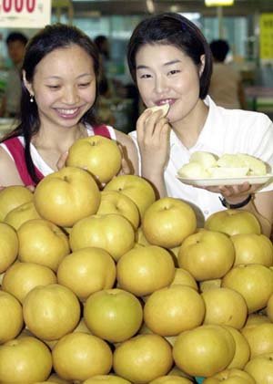 “秋季水果梨这么早就熟了!”5日,农协汉城良才Hanaro俱乐部展出了刚从地方收获的新鲜的梨。7.5公斤一箱的售价是32000~35000韩元。