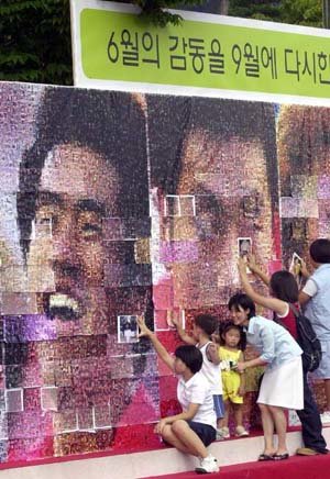 祈愿9月份的亚运会足球赛上获得第一,由韩国惠普公司赞助的大型工艺壁画于25日在汉城汝矣岛市民公园落成。特意到公园的主妇和孩子们模仿代表队选手们的相貌用工艺画法展示自己的本领。