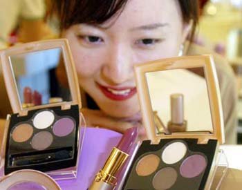 预计今年秋天会流行金黄色和紫红色系列彩妆产品。3日在汉城小公洞乐天百货店来到化妆品柜台的一位顾客环顾秋季新产品。