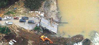 4日,乘坐空军作战司令部的直升机,从上空看到的江原三陟市一带。连接三陟市远德邑比谷里与佳谷面梧底里的佳谷川桥梁,遭到台风破坏而被冲断,致使佳谷面一带处于孤立状态。被冲断的桥梁和被驾驶员丢弃的车辆,真实地显示出了台风肆虐时的状况。