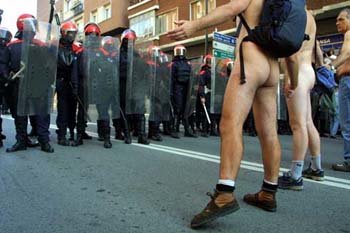主导了分离西班牙巴斯克地区运动的激进党“埃塔”的支持者们,抗议上月当局下达的取谛令,14日在巴斯克地区毕尔巴鄂市,裸着身体正与警察对峙着。