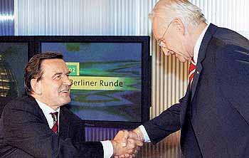 德国总理施罗德(左)和曾经是他强有力挑战者的艾德蒙特于22日竞选结束后在电视论坛中会面并握手。
