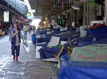 2日下午,汉城鹭梁津水产市场的商贩们抗议店铺租金上调等政策,撤出市场后展开抗议示威。