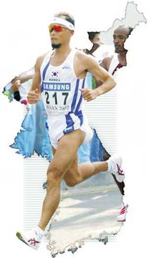 “南男”李凤柱(32岁)继“北女”咸凤实后,在釜山亚运男子马拉松比赛中又一次称霸。