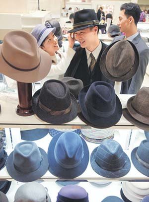 受到描述40年代暴力界的电视剧的影响,中年绅士的象征 “礼帽”作为新一代流行服饰品人气颇旺。24日在汉城狎鸥亭洞的现代百货店正挑选帽子的年轻人。