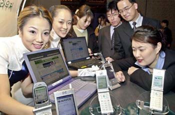 30日,KTF公司在汉城希尔顿酒店举行新产品—“KUN2002”的开发新闻发布会后,正在进行演示。此产品是能利用手机、掌上电脑(PDA)等无线通讯终端机,接入到互联网的有线、无线互联网合为一体的浏览器。此前,利用手机只能接入到无线互联网专用的网站。