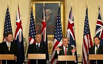 继澳大利亚和美国就澳大利亚向下一代轰炸机开发工作投入1.5亿美元达成协议后,两国有关负责部长于29日,在美国国务院共同举行记者招待会。左起澳大利亚外交部部长亚力山大·唐纳、美国国务卿科林·鲍威尔、美国国防部部长唐纳德·拉姆斯菲尔德、澳大利亚国防部部长罗伯特·希尔。