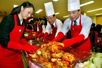 22日,新世界百货店部门代表金镇贤(右)等职员在汉城总部举行的“帮困爱心腌泡菜活动”中腌制泡菜。