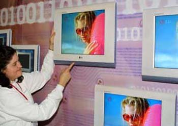 9日(当地时间),在美国拉斯维加斯举行的国际家电展(CES2003)上,数字综合展区的电视机相关产品大受青睐。图为LG电子生产的“Mira显示器”。