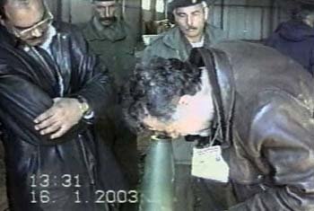 联合国武器核查团于16日在巴格达南部乌科哈德,正调查发现的空化学弹弹头,伊拉克官员神情紧张地看着。该核查场面拍自电视屏幕。