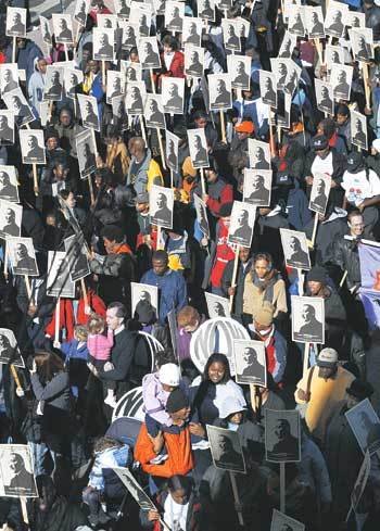 20日,纪念美国民权运动家马丁·路德·金牧师逝世22周年的游行队伍在北卡罗来纳州罗列市街道形成了人山人海。