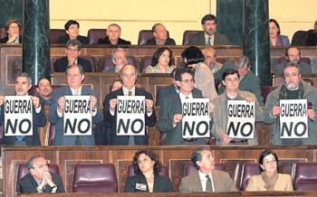 5日,西班牙首相阿兹纳尔在众议院进行演讲时,台下的西班牙政界人士们举着写有“反对战争”的标语,以此表明反对伊拉克战争的立场。