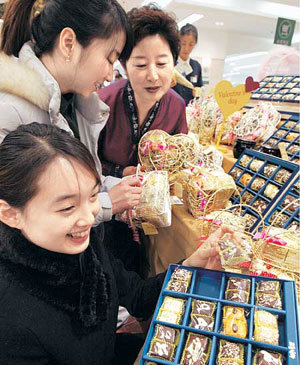 “把韩式糕点作为情人节礼物如何?”在距情人节还有5天的9日,在Galleria百货汉城时装馆食品柜台推出了在传统韩式糕点外包巧克力的商品(1~3万韩元左右)。