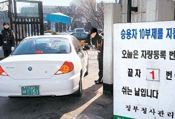 实施公共机关车辆10部制等政府能源节约对策第一天的11日,在汉城世宗路政府中央大厦入口处,交警正在管制违反车辆10部制的汽车。