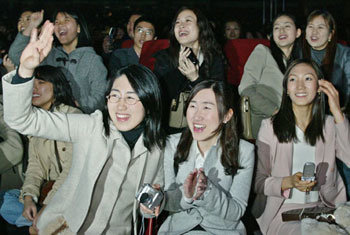 28日,在汉城西大门区庆熙大学举行的2003年新生入学欢迎式上,新生们在高兴地观看同校学生们的祝贺演出。