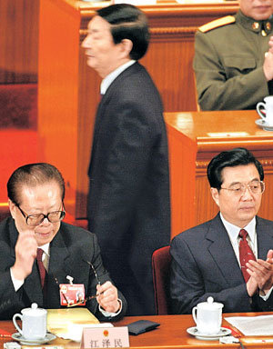 5日,在中国全国人大结束(5~18日)时即将退出政界的中国国务院总理朱镕基为做政府工作报告,正在经过国家主席江泽民(左)和党总书记胡锦涛(右)身后走向讲台。