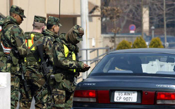 18日,由于美国总统乔治·W·布什发出最后通牒,美国对伊动武时期正在迫近,因此汉城龙山韩美联合司令部所属美军士兵正检查出入车辆。