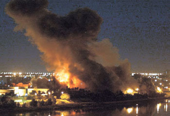 20日位于伊拉克首都巴格达市内底斯里斯河边的规划部大楼和周边的建筑物被熊熊烈火所包围。当天美国集中攻击了规划部大楼和总统府等设施。