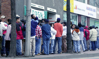 23日,外国劳工为了取消作为出国证据提出而预订的机票,排队等候在汉城宗路区惠化洞的一家旅行社前。据悉,虽然法务部去年接受非法滞留外国劳工的自愿申报,并采取了把3月末为止定为离境期限的措施,但外国劳工盼望新政府的外国劳工政策变化,推迟了出国日期。