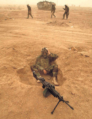 25日,在伊拉克出现强烈的沙尘暴。在伊拉克南部纳西里耶沙漠上,响起伊军利用化学武器攻击的警报后,一名美军海兵正在战壕带上防毒面具等防生化袭击装备。据悉,此次是错误警报。