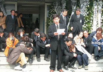 28日,因忠南天安市天安小学足球队宿舍火灾惨案,死亡的足球少年的遗属在檀国大医院太平房设立的共同焚香处前,举行了要求政府直接补偿,并敦促政府制定防止再发生事故对策的记者见面会。