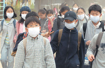 7日,在SARS恐怖日趋扩散的情况下,汉城永登浦区堂山洞堂西小学的学生们正带着口罩放学回家。