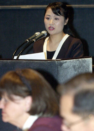 16日,在汉城凯悦酒店举行的为北韩自由投奔者人权的国际议会联盟创建总会上,逃北者金玉仁在为逃北者们的人权状况提供举证。