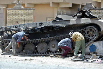 白天,巴格达市民正在大街上拆卸坦克部件。虽然战争已经结束,但因不断发生哄抢和纵火事件,进入另外一场战争的巴格达仍不时响起盗窃者和保护者之间的枪声。