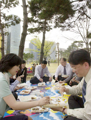 17日,因全国过早出现炎热天气,在汉城永登浦区汝矣岛公园的松树下,上班族正以出来郊游的心情吃着午饭。