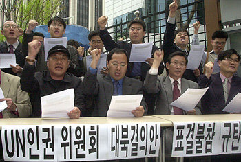 18日,北韩民主化网络等市民团体代表在汉城世宗路政府中央大楼分馆的外交通商部前举行谴责政府不参加联合国人权委对北人权表决案的记者招待会并呼喊口号。