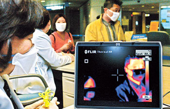 随着国内出现非典疑似患者,防疫工作面临巨大压力。29日,仁川国际机场检疫人员正在利用红外线感热装置,对从中国北京入境的乘客进行体温检查。