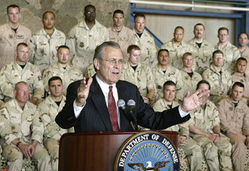 29日,美国国防部长唐纳德·拉姆斯菲尔德正在沙特阿拉伯斯普林顿苏丹空军基地向美、英联军进行演说。