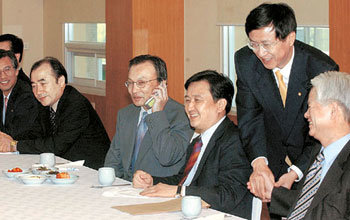2日,民主党新党推进议员们正在与事务总长李相洙(左一)举行聚会。
