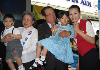 5日,由大韩航空任命的艺人一日支店长姜富子(左)和沈洋弘(中)在汉城江南区三成洞贸易中心举行的韩国国际观光展(KOTFA)上,与孩子们一起度过快乐时光。大韩航空为挽救受伊拉克战争和非典影响陷入困境的旅游业界氛围,举行了一日支店长活动。