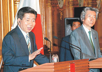 7日,在东京迎宾馆举行的联合记者招待会上,韩国总统卢武铉(左)和日本首相小泉纯一郎正在解释首脑会谈结果。