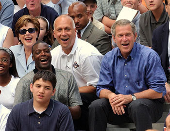 22日,布什总统夫妇面带微笑观看在白宫举行的陆军勇士小棒球队和海军洋基小棒球队间的棒球赛。总统夫妇间坐着的是已隐退的棒球选手里普肯。