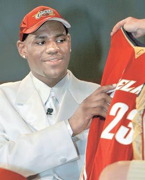 年仅18岁的高中毕业生明星新人詹姆斯27日在美国纽约麦迪逊广场花园进行的2003美国职业篮球(NBA)新秀选拔上排位第一,被克里夫兰骑士队选中。