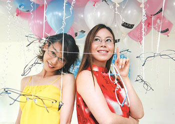 推出重量只有3~4g的眼镜架“Cara”的大光眼镜商社在汉城明洞专卖店举行了展示活动。图中,眼镜架被系在气球上飘在空中。生产商介绍说,眼镜架用钛合金制作而成,不仅轻便,且对皮肤无任何刺激。