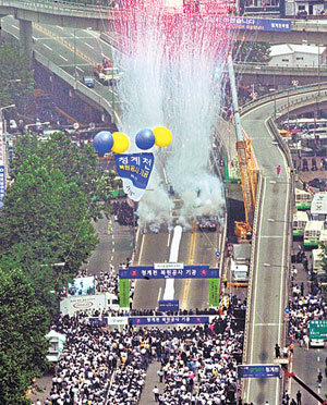 1일 오후 2시 청계고가도로 시작 지점인 서울 중구 장교동 청계2가에서 열린 청계천 복원공사 기공식. 이명박 시장 등이 공사 시작을 알리는 버튼을 누르자 화려한 불꽃이 하늘로 치솟고 있다. 개발시대의 상징인 서울 도심의 청계고가도로를 걷어내고 청계천을 되살리는 대역사가 시작됐다.