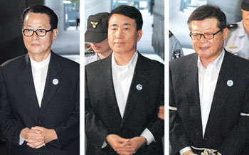 대북송금 의혹사건 첫 공판이 열린 4일 오후 서울 서초구 서초동 서울지방법원 안으로 구속 피고인 3명이 들어서고 있다. 왼쪽부터 박지원 전 문화관광부 장관, 이기호 전 대통령경제수석비서관, 이근영 전 산업은행 총재.